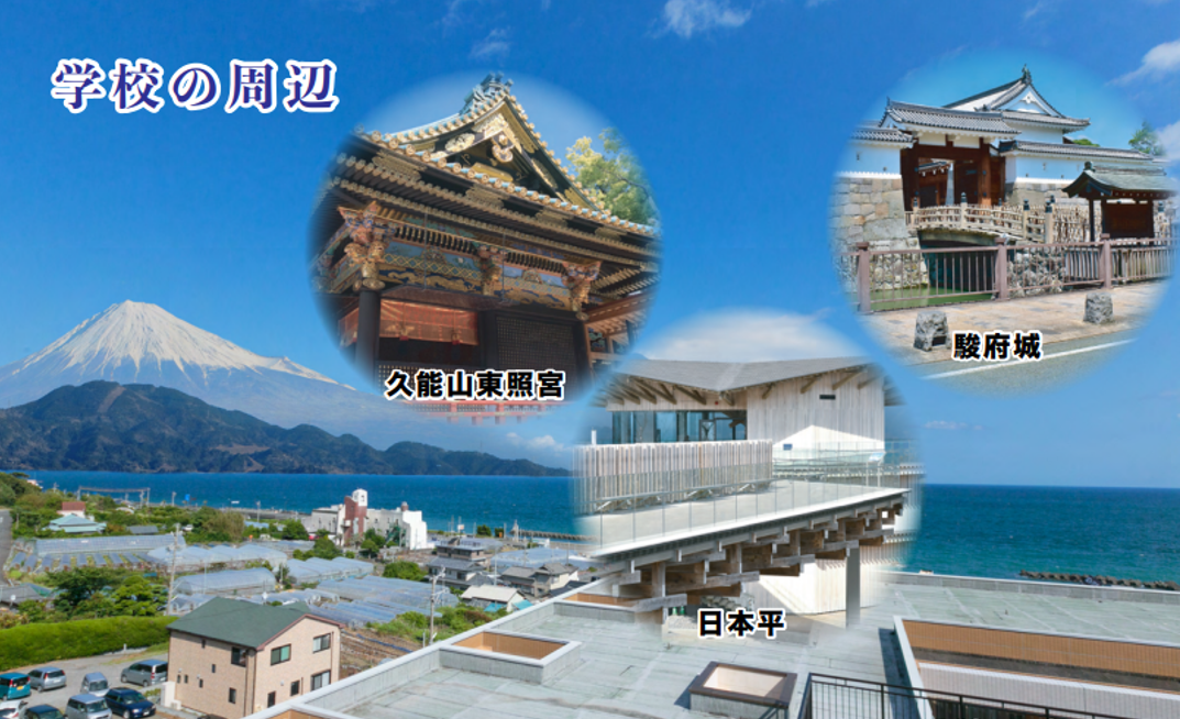世界遺産である久能山東照宮の麓、温暖な気候と豊かな自然に恵まれた、いちご栽培が盛んな地域に位置しています。静岡市が掲げる「文化と産業の都市」構想の下、日本ならではの魅力を存分に感じられる素晴らしい環境です。また、富士山をはじめとする数々の世界遺産へのアクセスも良く、学習と並行して、日本各地の文化や歴史に触れることができるのも、本校ならではの魅力です。