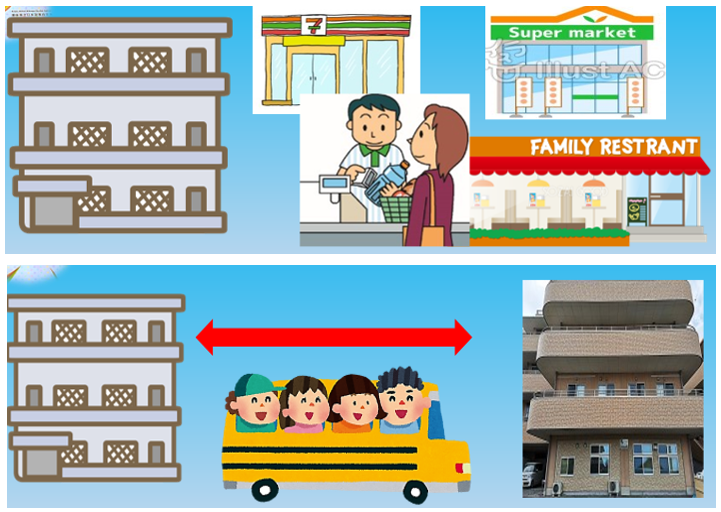 学生寮は、静岡市の便利なところに準備します。学生寮から学校までは車で送迎します。